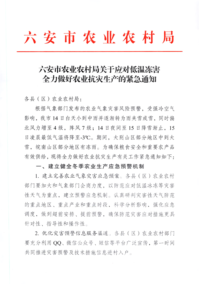 | 名 称: | 【转发】六安市农业农村局关于应对低温冻害全力做好农业抗灾生产的紧急通知 |