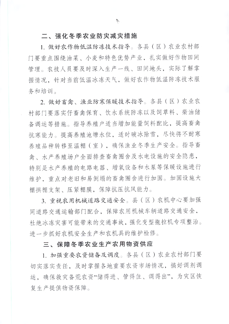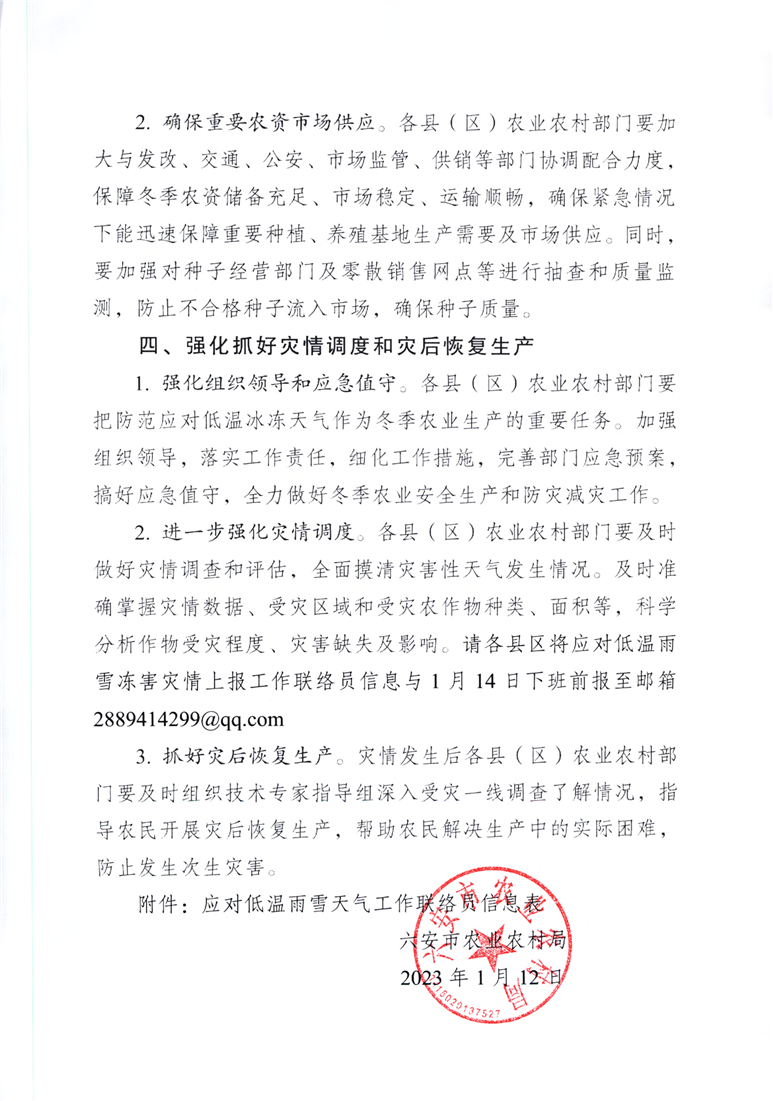 | 名 称: | 【转发】六安市农业农村局关于应对低温冻害全力做好农业抗灾生产的紧急通知 | ||