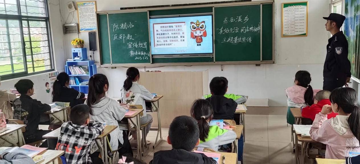 随着活动的开展,宣传小队也将反邪教宣传搬进课堂,东西溪乡派出所民警以“打击邪教,守护家庭”为主题,通过讲解案例、你问我答以及播放警示教育片,为孩子们上了一节生动的反邪课。