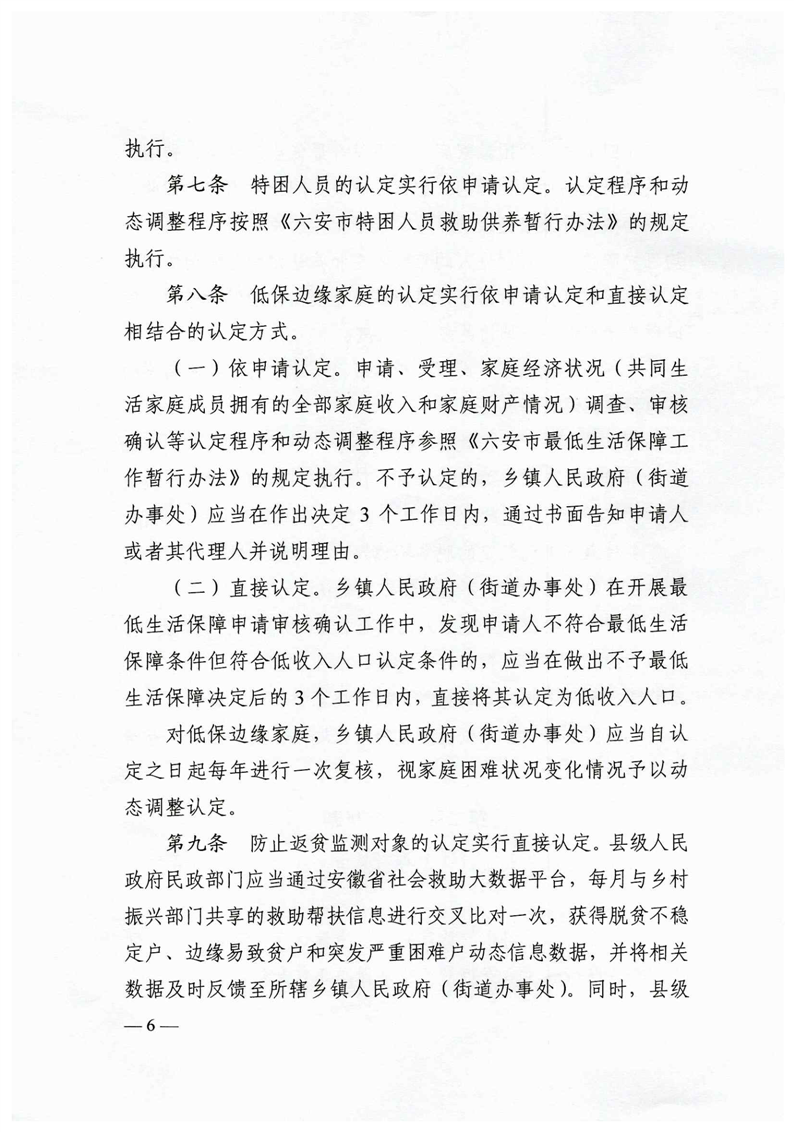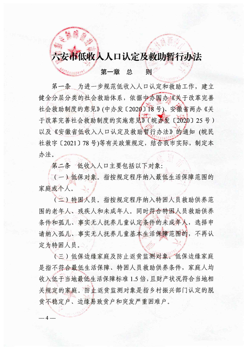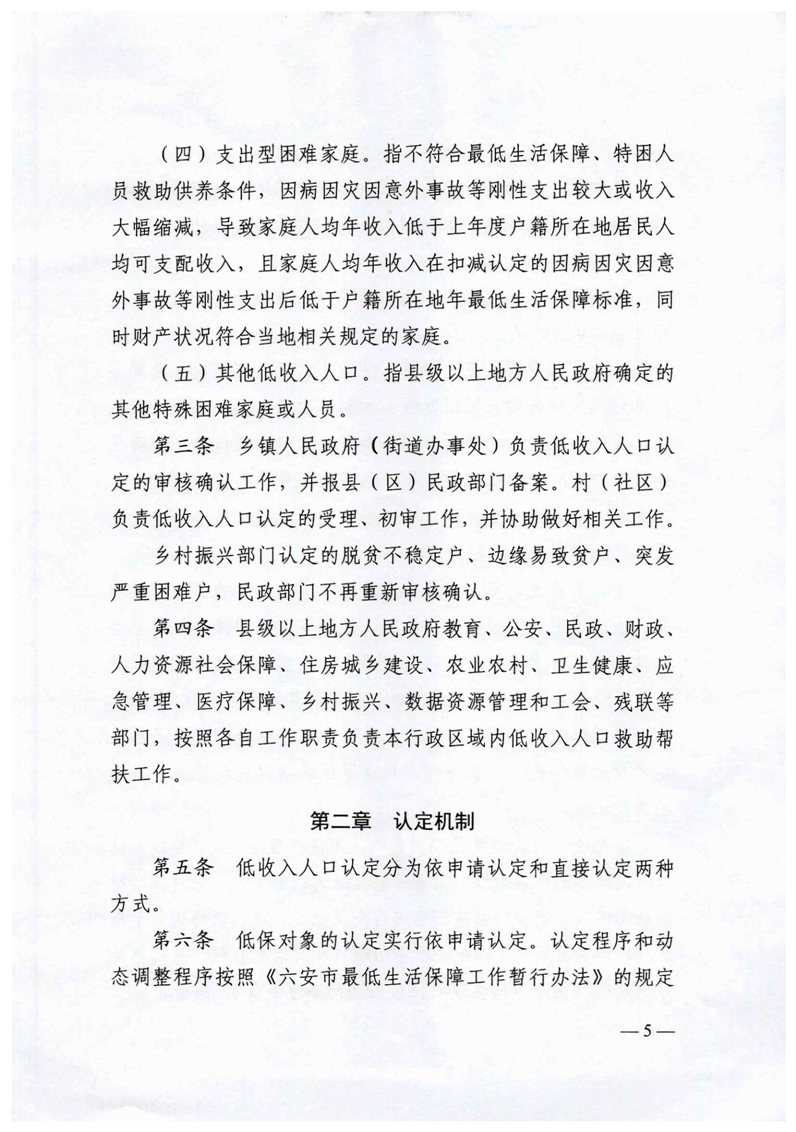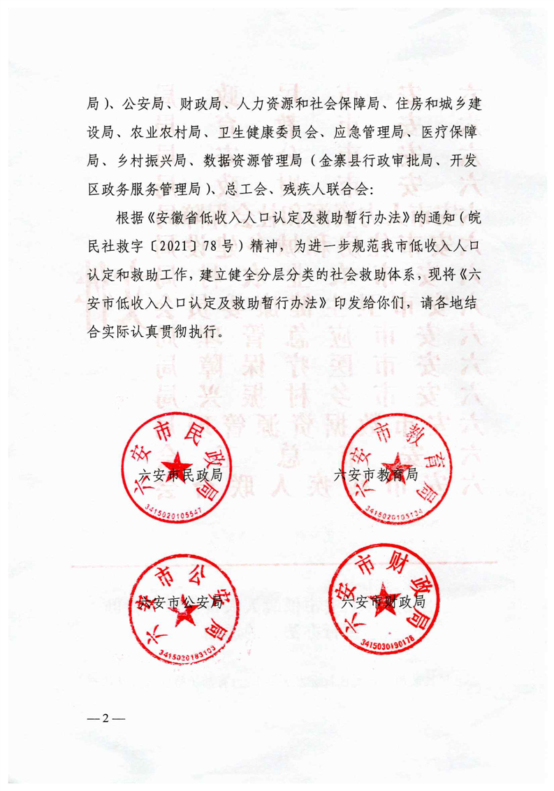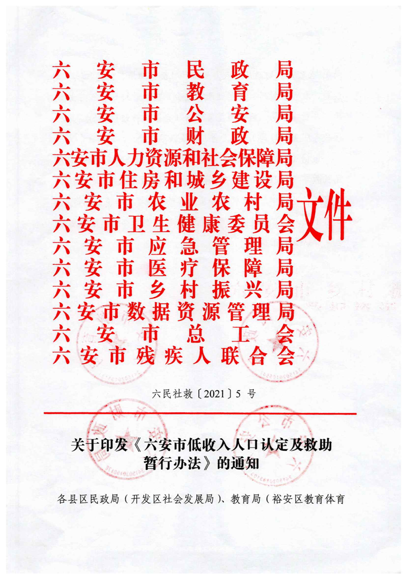 | 名 称: | 六民社救[2021]5号关于印发《六安市低收入人口认定及救助暂行办法》的通知 |