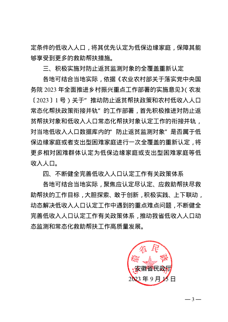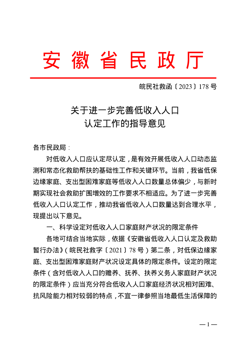 | 名 称: | 皖民社救函〔2023〕178号《关于进一步完善低收入人口认定工作的指导意见》 |