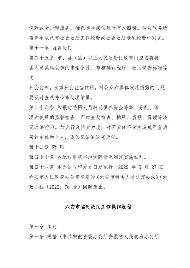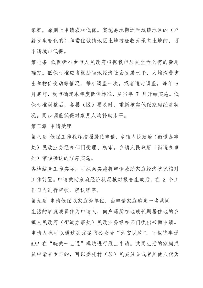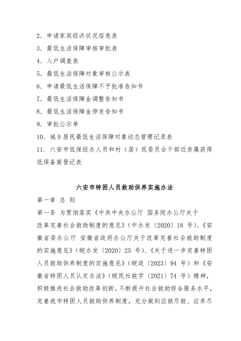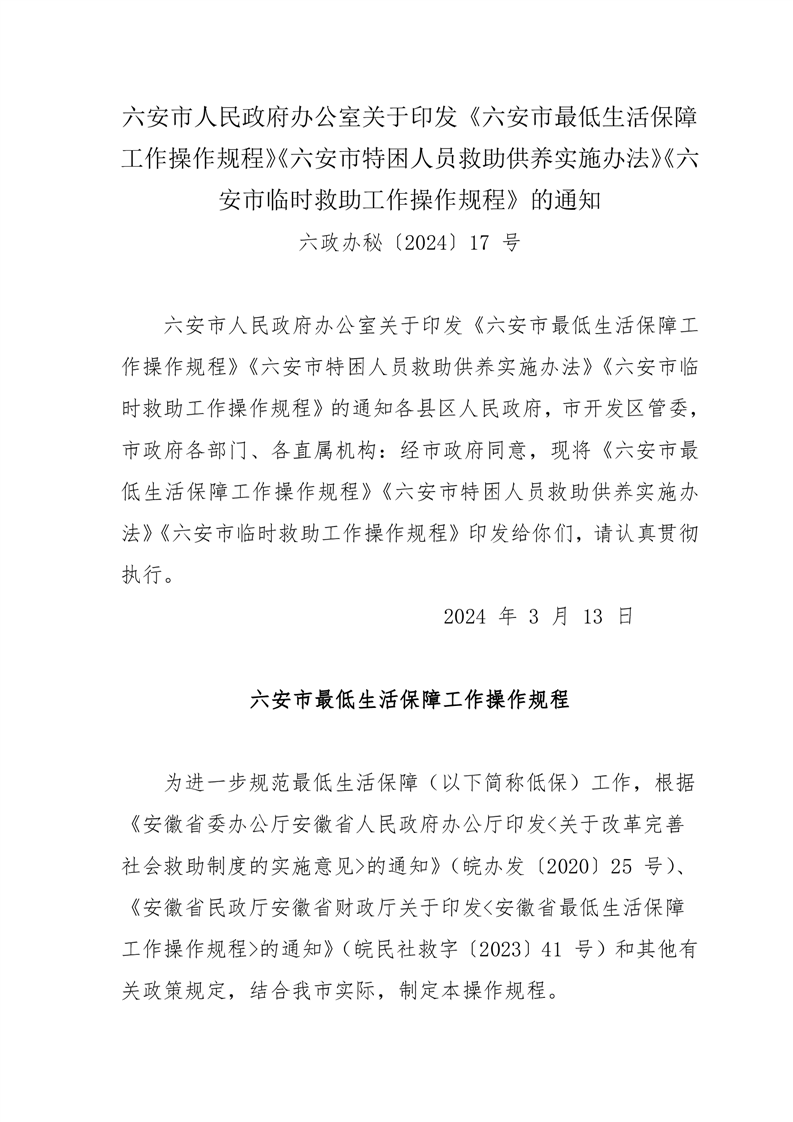 | 名 称: | 六安市人民政府办公室关于印发《六安市最低生活保障工作操作规程》《六安市特困人员救助供养实施办法》《六安市临时救助工作操作规程》的通知 |