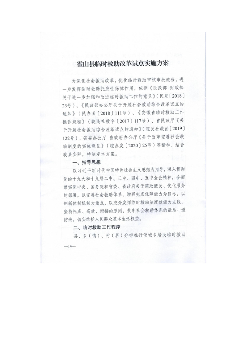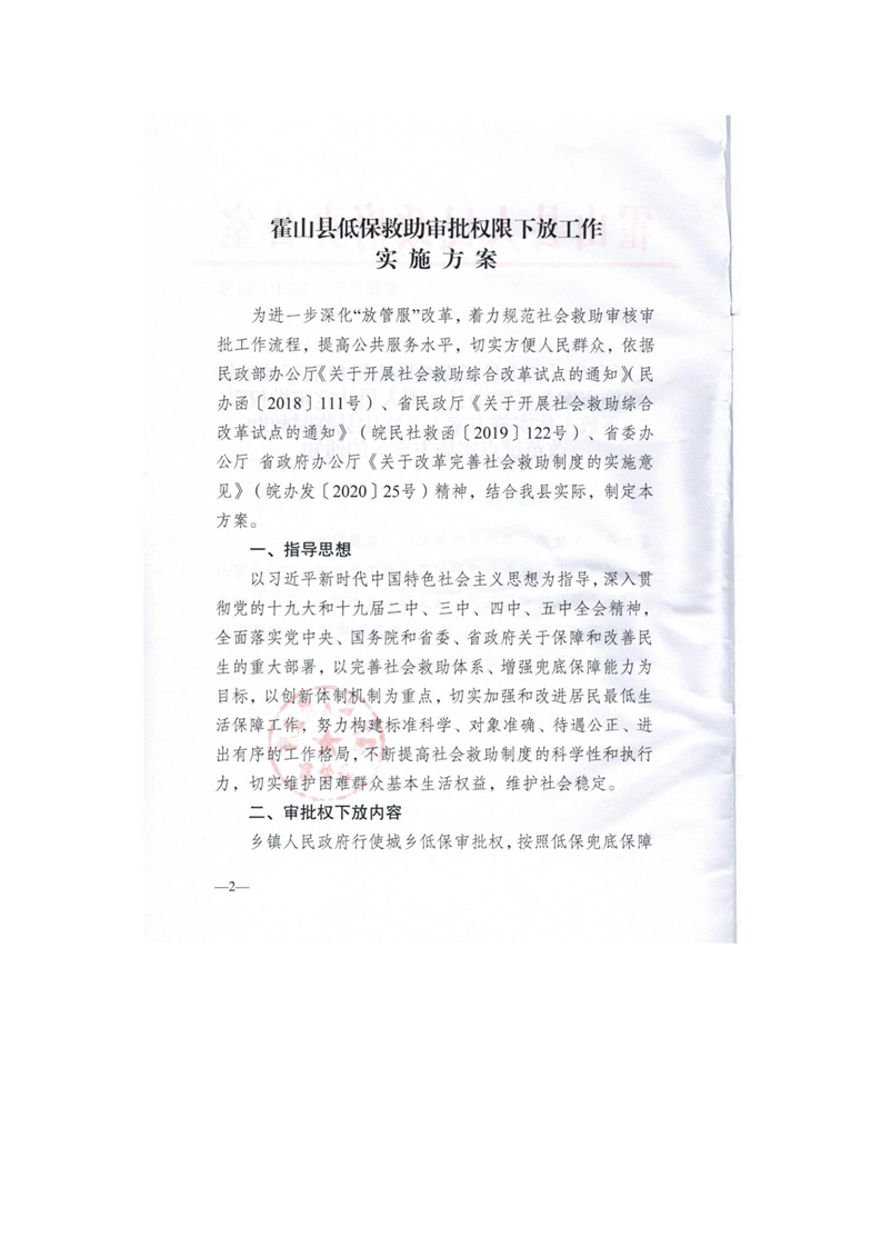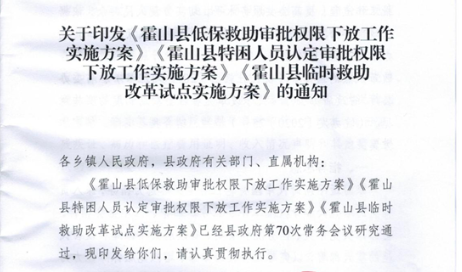 | 名 称: | 【配套政策法规文件】关于印发《霍山县低保救助审批权限下放工作实施方案》《霍山县特困人员认定审批权限下放工作实施方案》《霍山县临时救助改革试点实施方案》的通知(霍政办秘〔2021〕30号) |