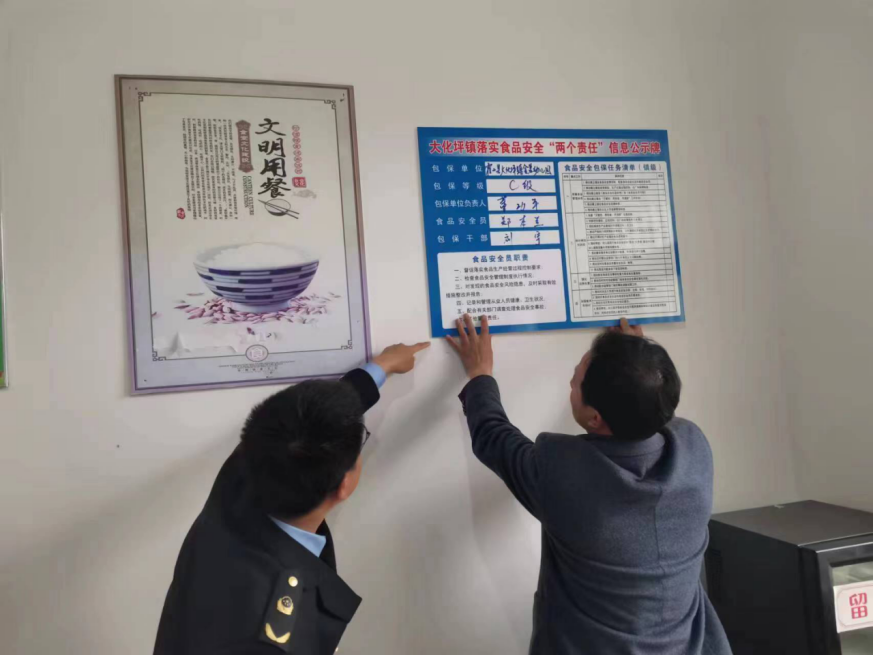 随后,工作人员为落实食品安全“两个责任”工作,对辖区内CD级包保单位进行了安全检查,同时张贴食品安全“两个责任”信息公示牌,确保群众“舌尖上的安全”。