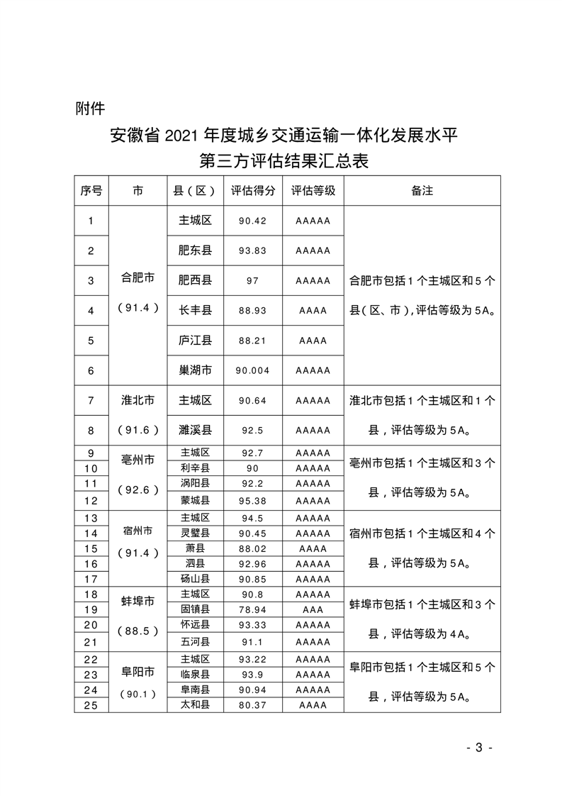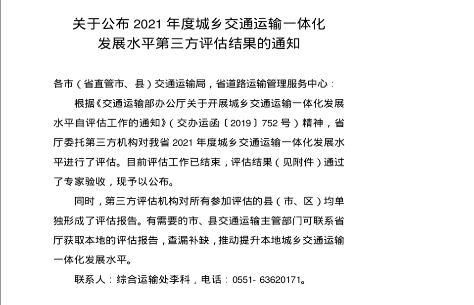 | 名 称: | 【城市公共交通服务质量评价信息】关于公布 2021 年度城乡交通运输一体化发展水平第三方评估结果的通知 |