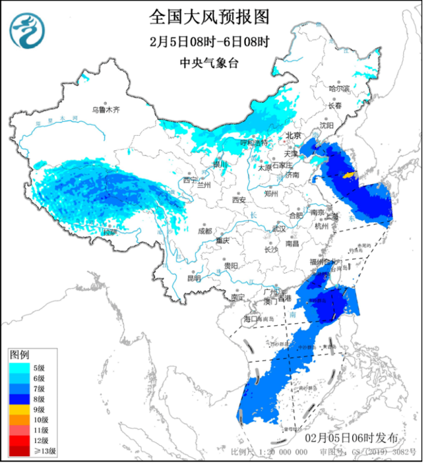 :5日,西藏中北部、青海南部、内蒙古中西部、华北北部等地部分地区有5~6级、阵风7~8级的大风,其中,西藏中北部、青海西南部的部分地区风力可达6~8级、阵风9~11级;渤海、渤海海峡、黄海大部海域、东海北部海域、台湾海峡、巴士海峡、南海东部和西南部海域将有7~8级、阵风9~10级的大风,其中黄海东南部的部分海域风力可达9级、阵风10级。