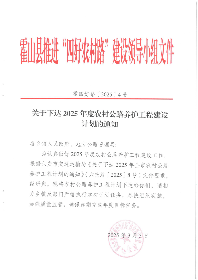 | 名 称: | 【农村公路养护管理信息】关于下达2025年度农村公路养护工程建设计划的通知 |
