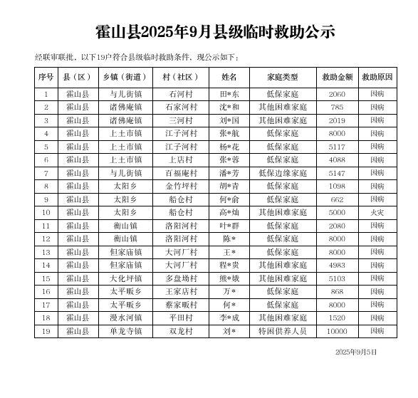 | 名 称: | 霍山县民政局2025年9月临时救助审批信息列表 |