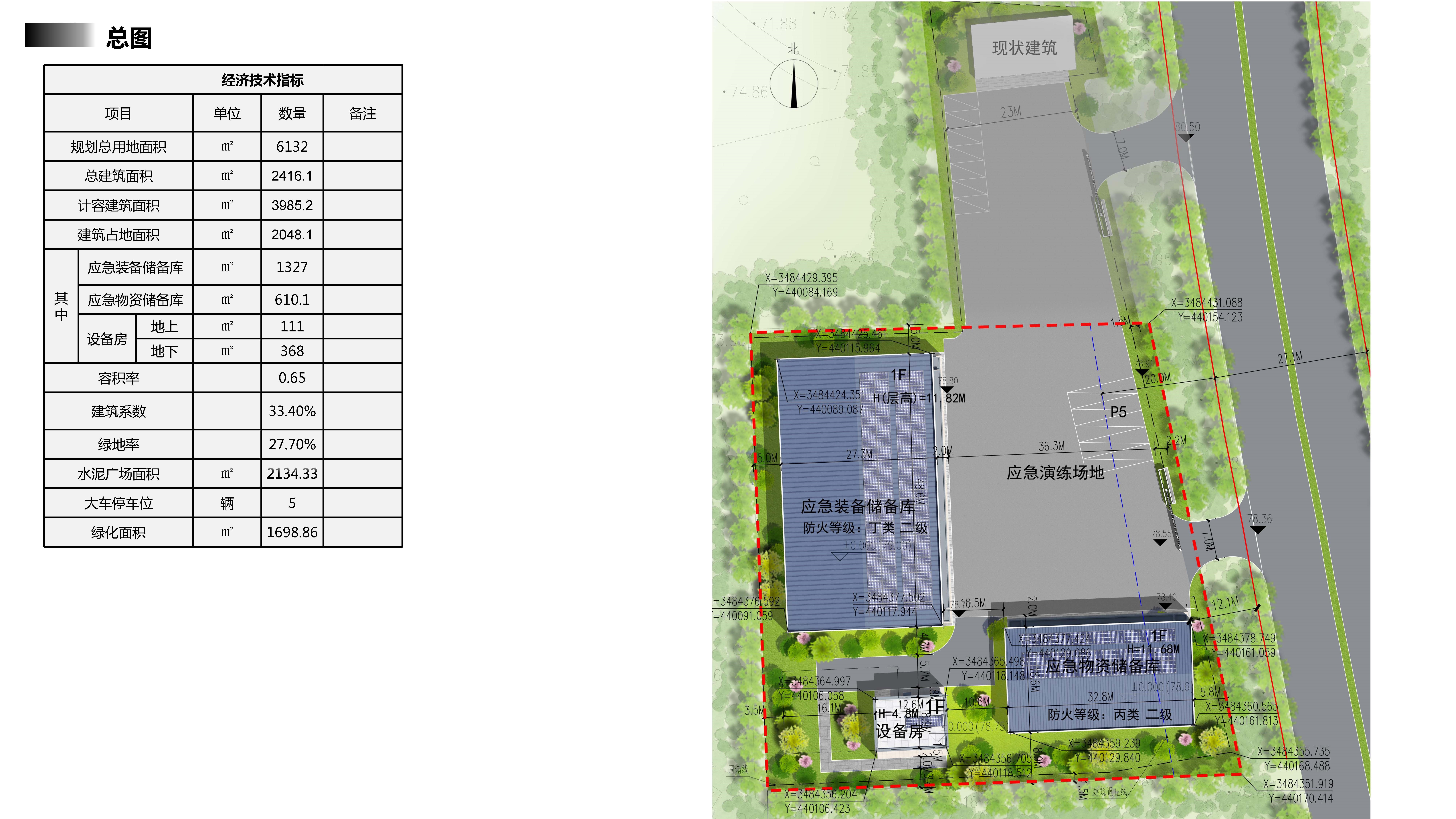 1、项目概况:位于下符桥镇下符桥村G105西侧,用地面积约9.2亩。该项目拟拆除下符桥道班原有建筑,规划新建应急装备储备库、应急物资储备库和设备用房各1栋,建筑层数均为1层,规划总建筑面积约2417平方米,计容总建筑面积约3986平方米,容积率0.65,建筑密度33.4%,绿地率27.7%。