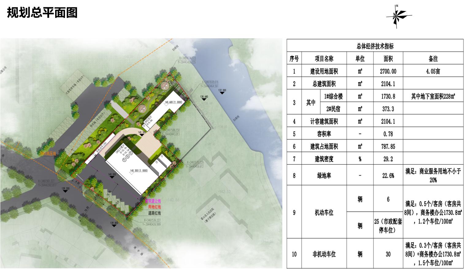 1、项目概况:位于单龙寺镇区姚中路北侧、单龙寺镇公交站以南,用地面积约4.1亩。该项目规划新建1栋3层综合楼和1栋2层民宿,规划总建筑面积约2105平方米,计容总建筑面积约2105平方米,容积率0.78,建筑密度29.2%,绿地率22.6%。