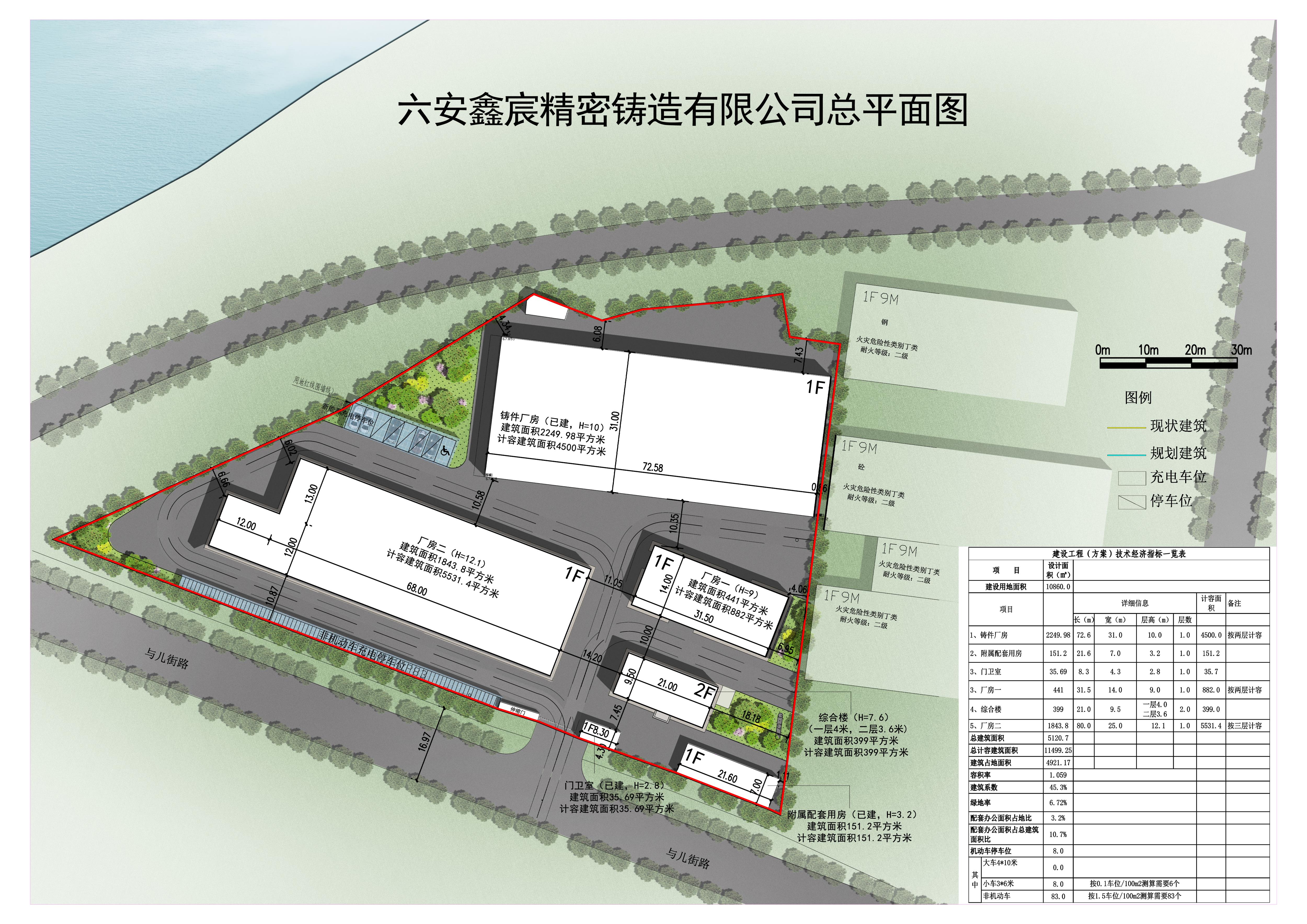 1、项目概况:位于县经济开发区与儿街路以北、白马尖路以西,用地面积约16.3亩。厂区已建1栋铸件厂房和1栋附属配套用房,规划新建2栋1层钢结构厂房和1栋2层综合楼,规划总建筑面积约0.5万平方米,计容总建筑面积约1.1万平方米,容积率1.06,建筑系数45.3%,绿地率6.7%。