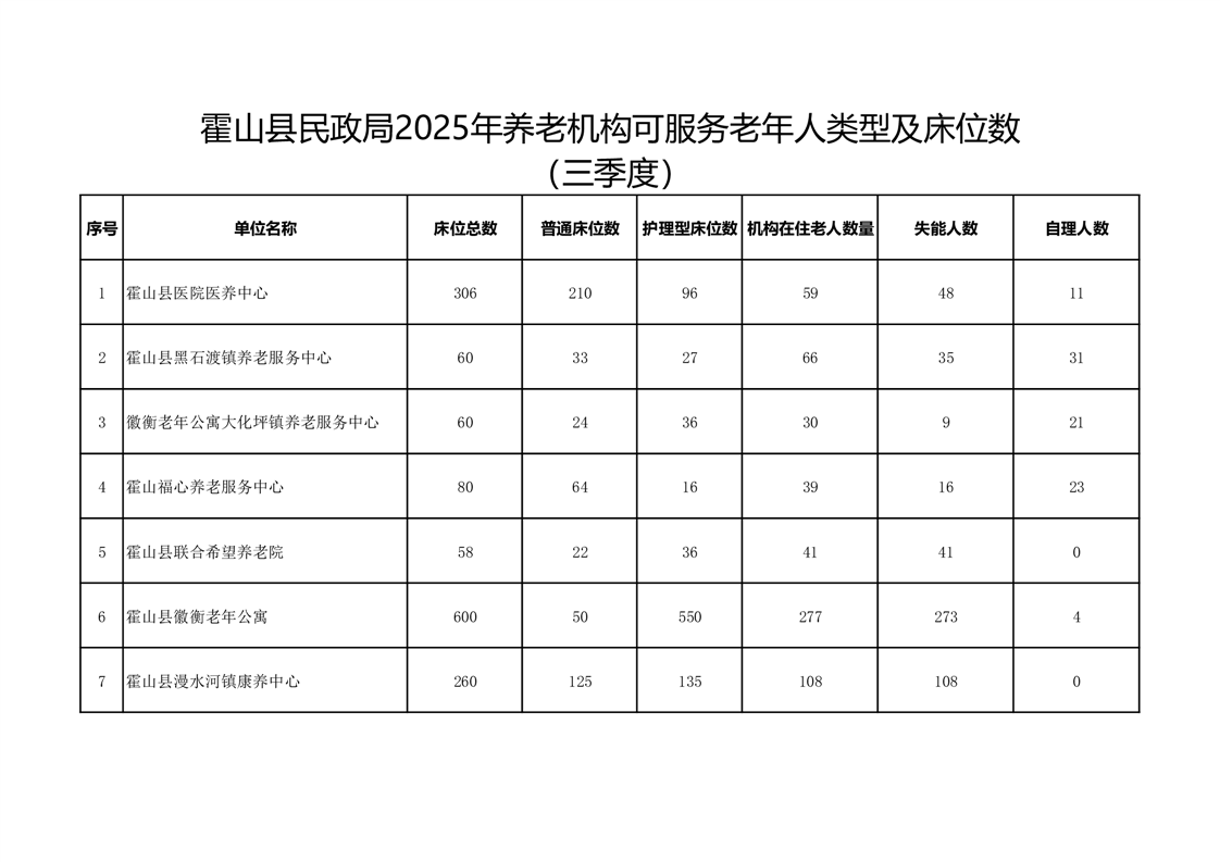 | 名 称: | 霍山县民政局2025年养老机构可服务老年人类型及床位数(三季度) |