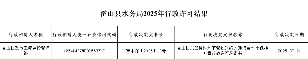 | 名 称: | 霍山县水务局2025年行政许可结果(十四) | ||