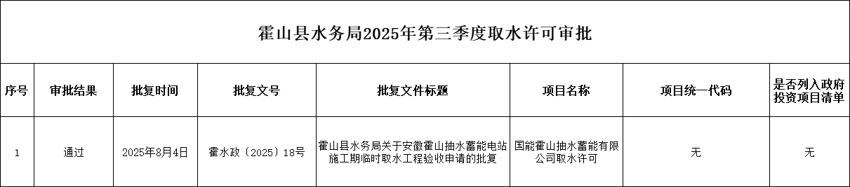| 名 称: | 霍山县水务局2025年第三季度取水许可结果 |