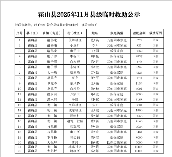 | 名 称: | 霍山县民政局2025年11月临时救助审批信息列表 |