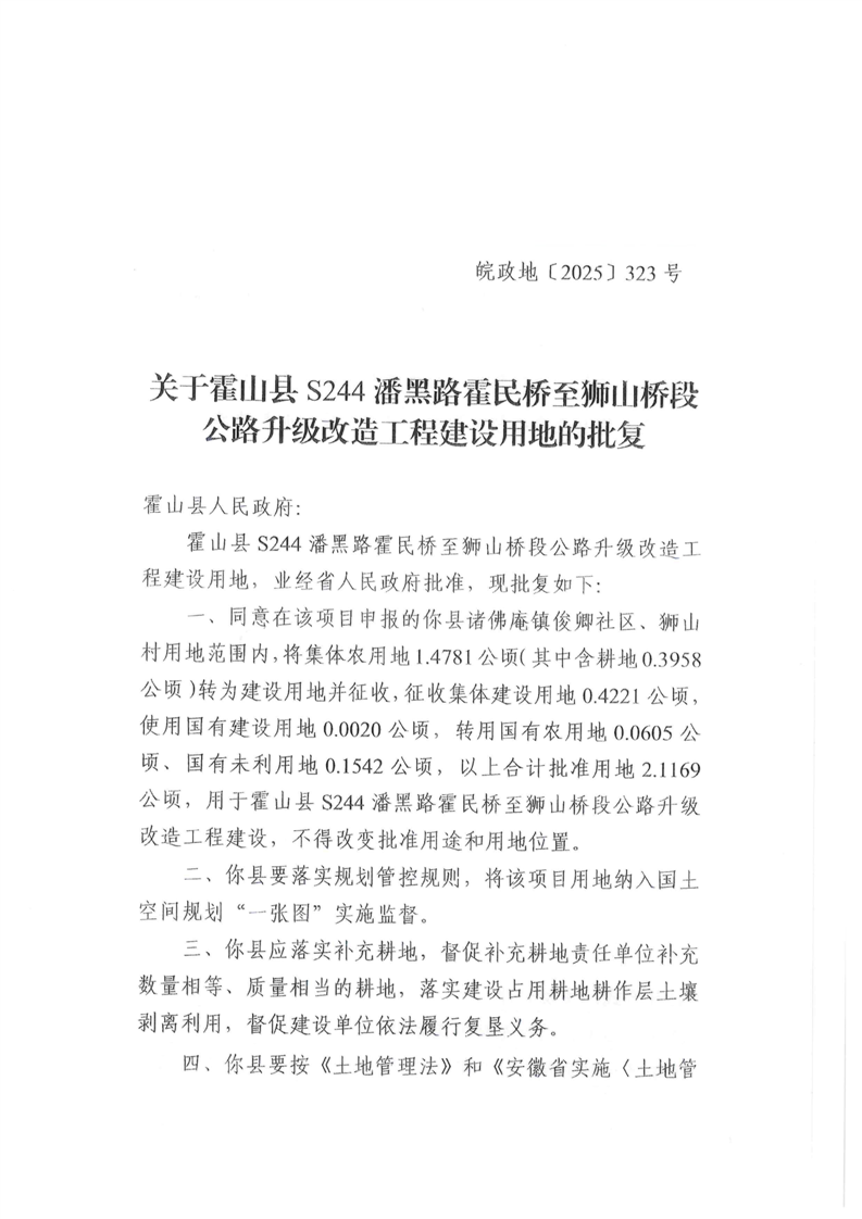 | 名 称: | 关于霍山县S244潘黑路霍民桥至狮山桥段公路升级改造工程建设用地的批复 | ||