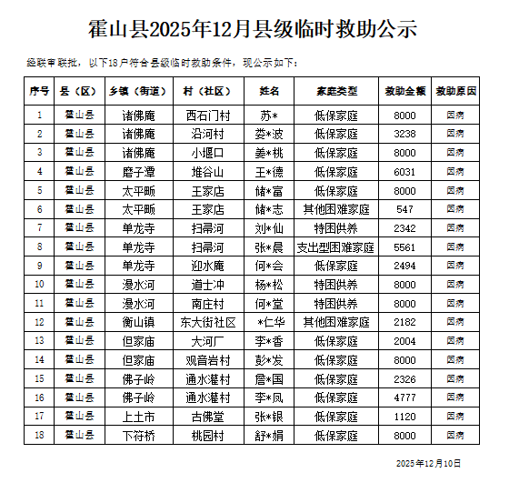 | 名 称: | 霍山县民政局2025年12月临时救助审批信息列表 |
