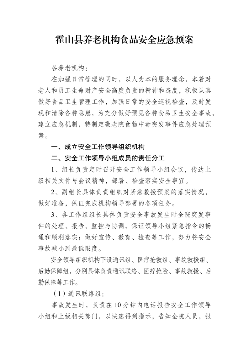 | 名 称: | 霍山县养老机构食品安全应急预案 |