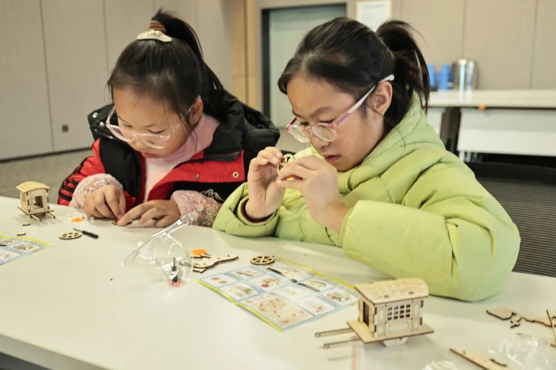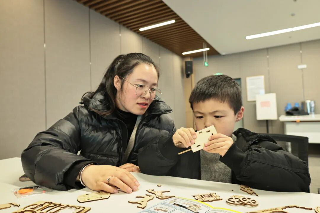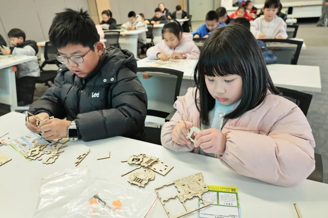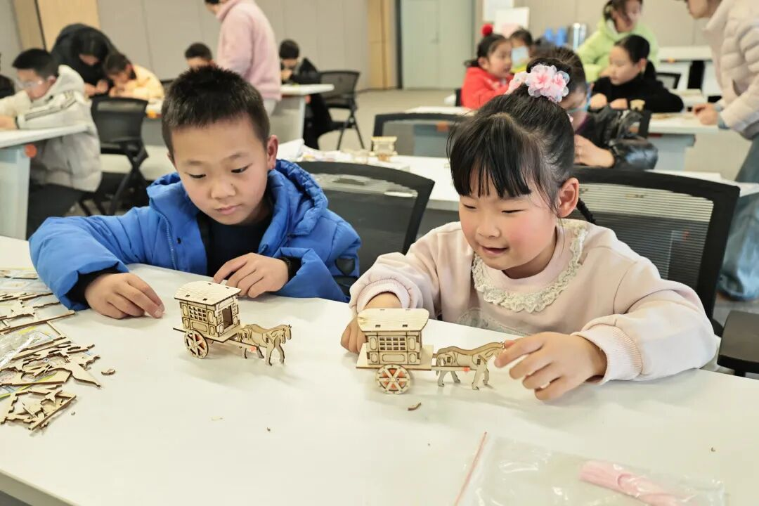 进入制作环节,小读者们化身为小工匠,认真比对齿轮与铁轴的安装位置,小心翼翼地将木板等部件拼接、固定,再反复调试,确保部件严丝合缝。完成制作后,大家兴奋不已,轻轻推动车轴,齿轮相互咬合传动,车轮滚滚向前,好似古代马车在奔腾。