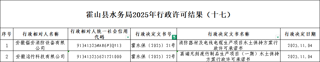 | 名 称: | 霍山县水务局2025年行政许可结果(十七) | ||