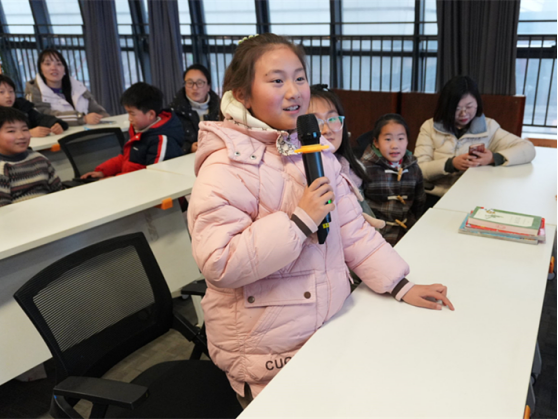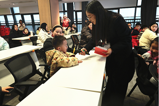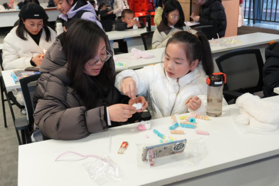 随后开展的“书香暖冬”亲子手作活动,围绕“把爱带回家·同心护成长”主题,设置了“马上幸福”亲子分享、“马上平安”安全教育、“马上快乐”手工制作三个环节,巧妙融合文化传承、亲情交流与安全教育。活动首先通过短片带领参与者探寻手套的历史演变,感受其蕴含的文化内涵与温暖寓意。在“马上幸福”亲子分享环节,孩子与家长们踊跃分享自家年俗、家庭趣事及新年愿望,真挚的讲述引发阵阵掌声,温情在亲子间流转,温暖在家庭间传递。“马上平安”安全教育环节播放了专题短片,向家长和孩子们系统讲解寒假期间应注意的安全事项,切实增强安全防护意识,为孩子们平安度过假期保驾护航。最后到了“马上快乐”扭扭棒毛绒手套手工制作环节。在家长的耐心陪伴与协助下,孩子们充分发挥想象力,精心制作出各具特色的毛绒手套。这些色彩缤纷、充满创意的手工作品,不仅是冬日的温暖象征,更是亲子协作的美好见证,现场洋溢着欢乐温馨的氛围。