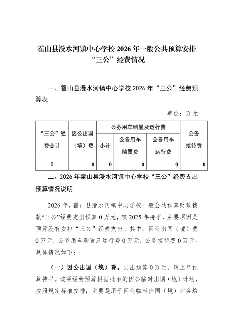 | 名 称: | 霍山县漫水河镇中心学校2026年一般公共预算安排“三公”经费情况 | ||