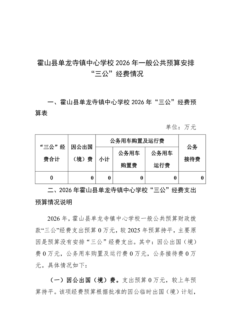 | 名 称: | 霍山县单龙寺镇中心学校2026年一般公共预算安排“三公”经费情况 |