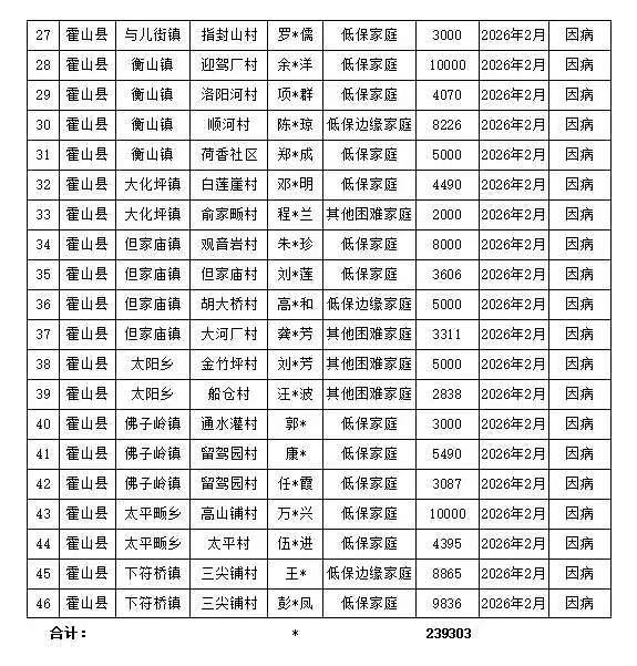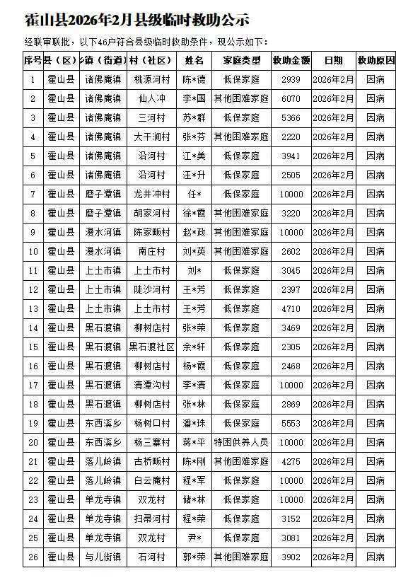 | 名 称: | 霍山县民政局2026年2月临时救助审批信息列表 |
