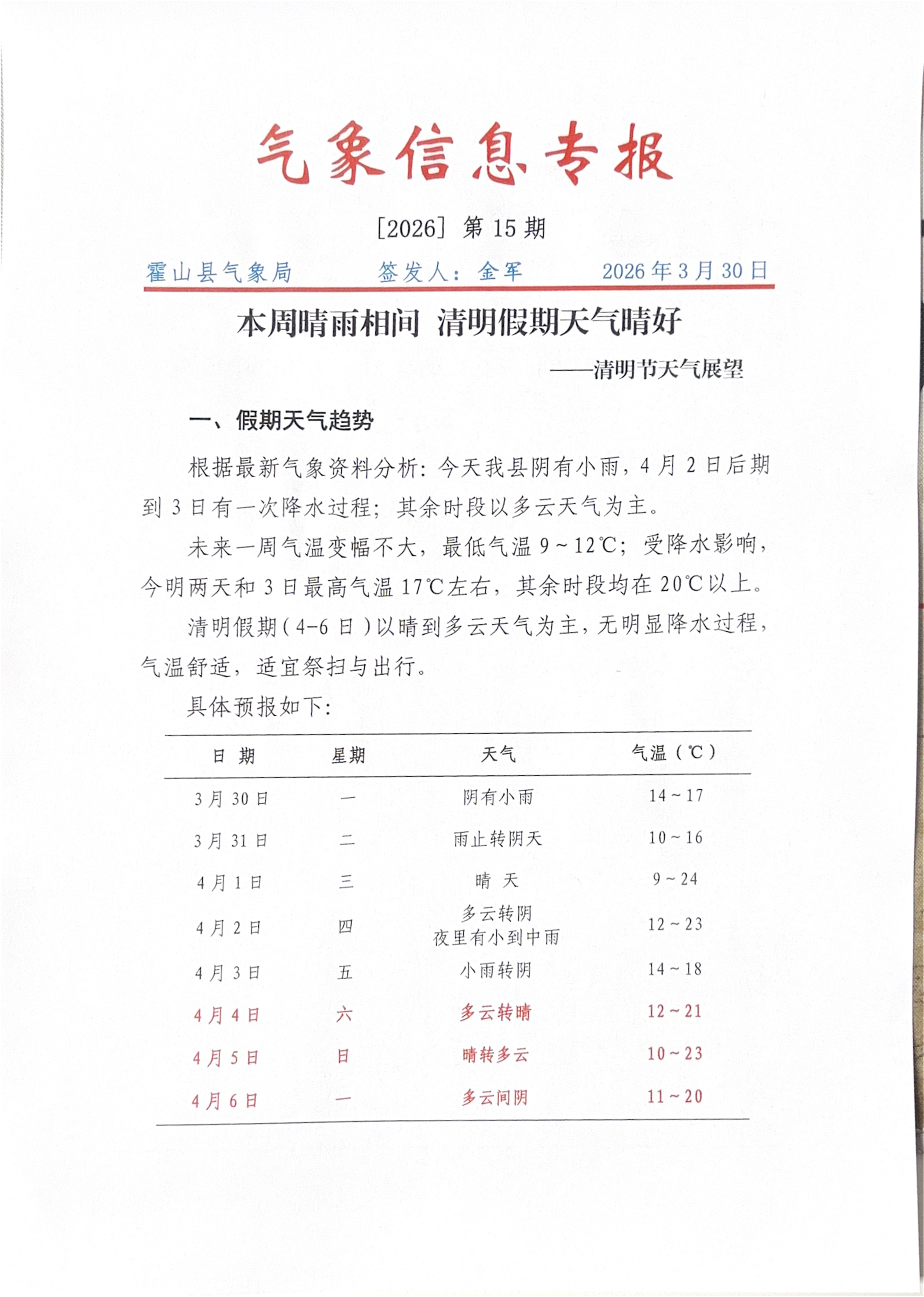 | 内容分类: | 发布公众气象预报 | 发文日期: | 2026-03-30 15:59:03 |