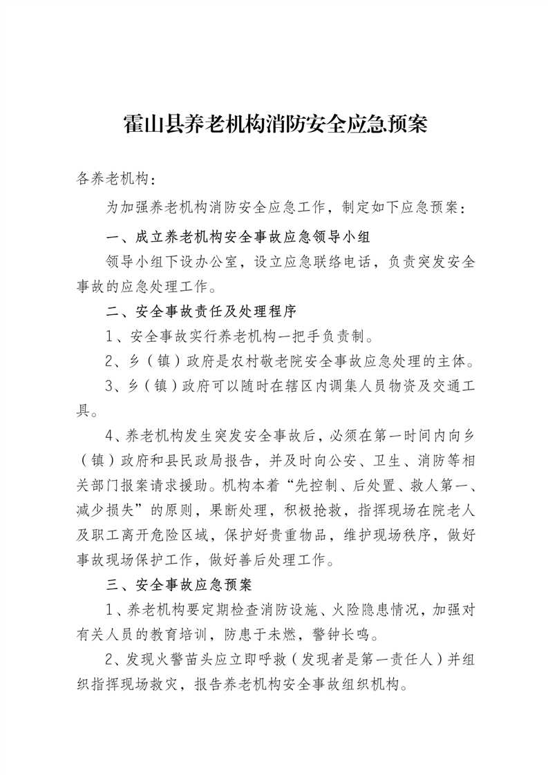 | 名 称: | 霍山县养老机构消防安全应急预案 |