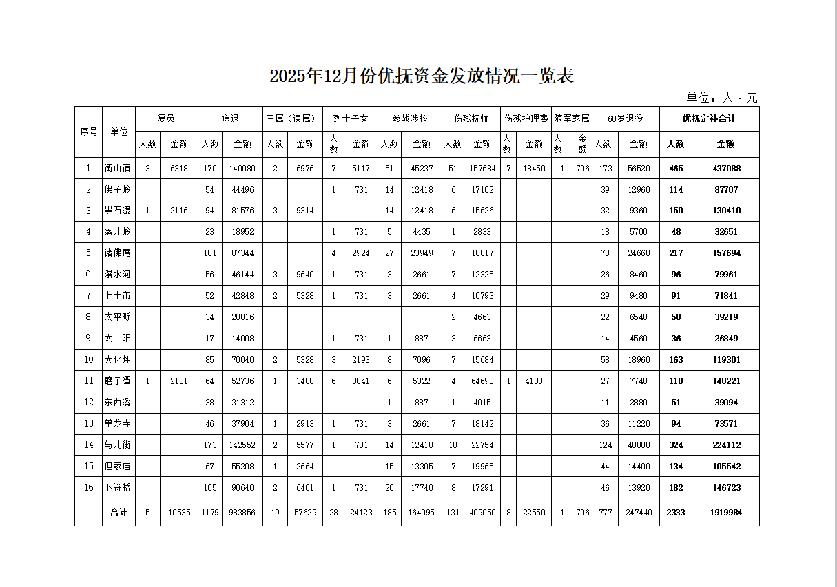 2025年12月份优抚资金发放情况一览表