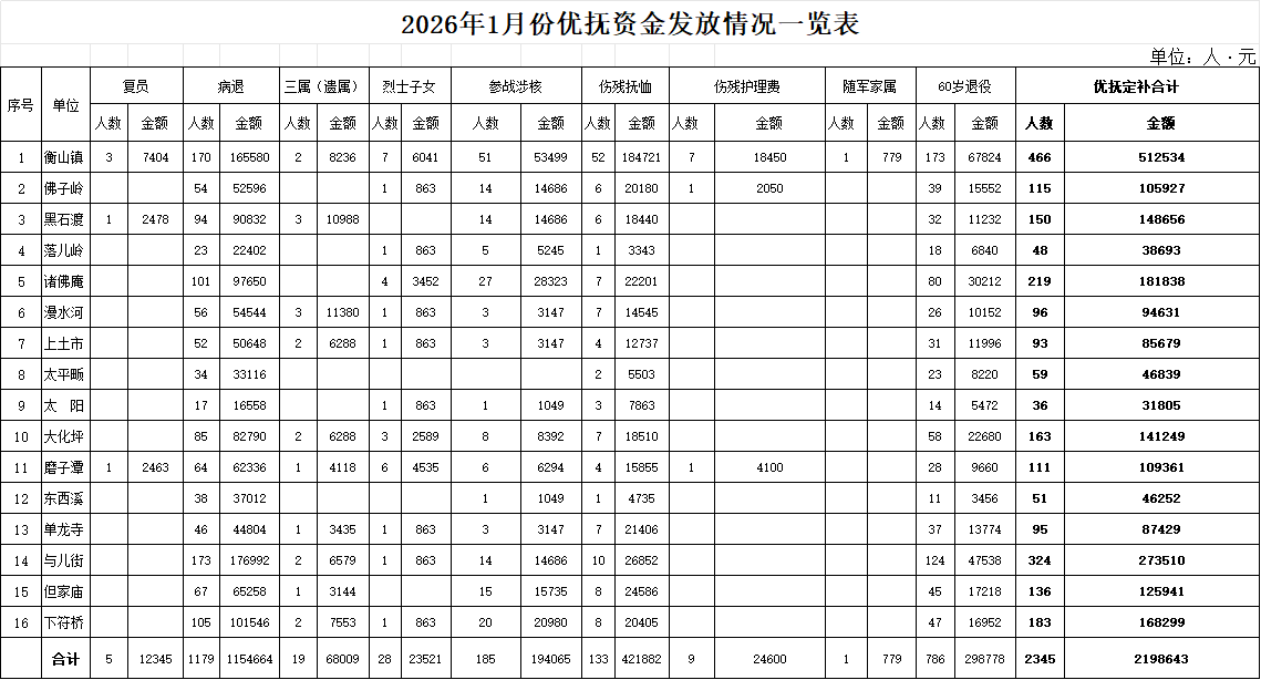 2026年1月份优抚资金发放情况一览表