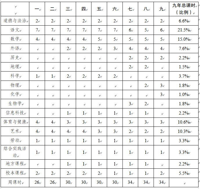 各科目安排及占九年总课时比例