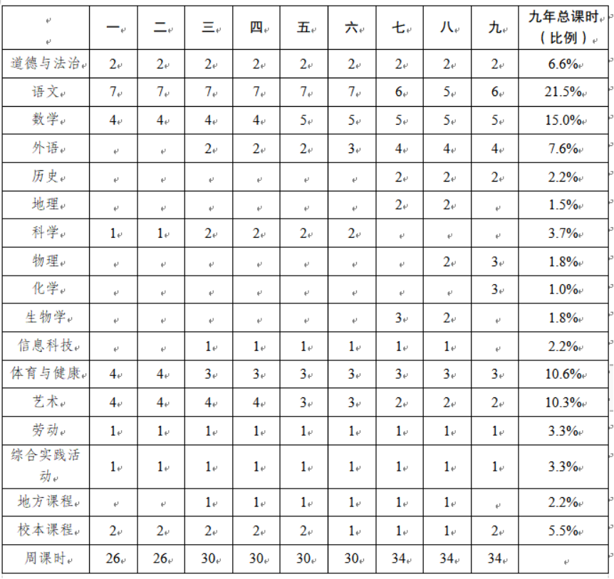 一至二年级每周26课时,三至六年级每周30课时,七至九年级每周34课时,九年新授课总课时数为9522。小学每课时按40分钟计算,初中每课时按45分钟计算。