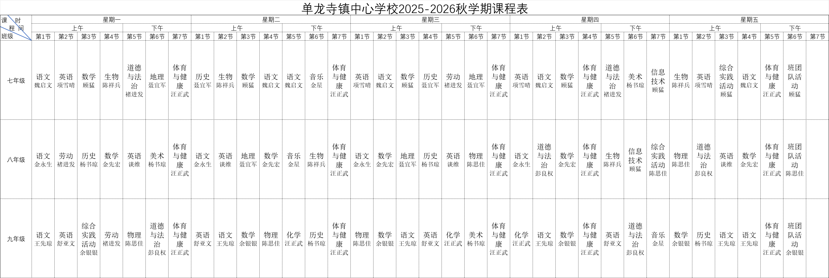 单龙寺镇中心学校初中课程表