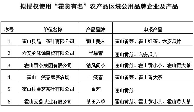 按照《霍山县农产品区域公用品牌使用管理办法》(修订版)相关规定,经霍山县农业产业发展中心联合相关部门审核,对第11批6家拟授权使用“霍货有名”农产品区域公用品牌的企业及产品名录进行公示。