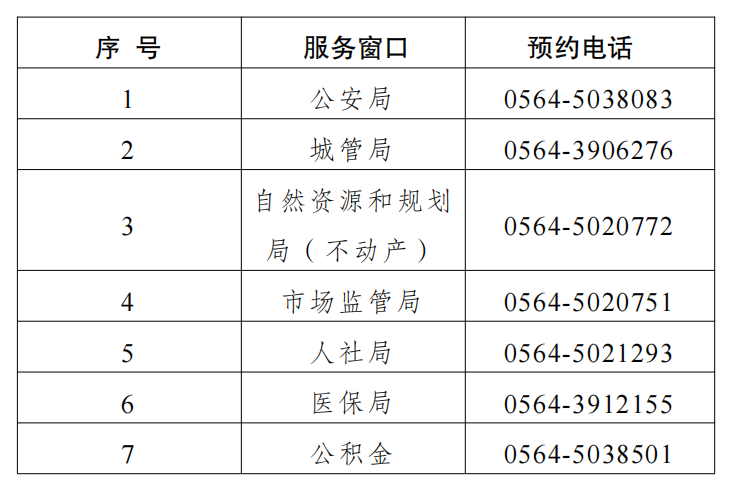 放假期间,广大居民朋友还可通过“皖事通APP”、安徽政务服务网六安分厅(https://la.ahzwfw.gov.cn/)、霍山县7×24小时政务服务大厅等渠道办理业务。本次预约服务不含水、电、气等公共服务窗口。如需办理水、电、气报装及缴费,可选择线上缴费或前往相关营业厅办理,具体地址及服务热线如下: